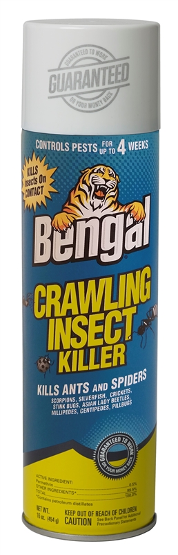 Bengal Crawling Insect Killer, 16 oz, Aerosol Can, Usage Location: Indoor, Outdoor, Slight Solvent, White, Compositions: Permethrin, Petroleum Distillates, Liquefied Petroleum Gas, VOC Content: <98 %, Application Method: Spray, Flammability Rating: 4, <130 deg F, Vapor Pressure: 70 psig, Specific Gravity: 1
