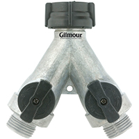 The Gilmour 800214-1001 is a heavy-duty Y-connector designed to split a single water source into two independently controlled outlets. Constructed from durable aluminum with a chrome finish, this dual shut-off valve provides up to 45% more water flow than standard valves, making it ideal for high-performance sprinklers and nozzles. The extra-large handles offer an easy grip for precise flow control, while the swivel connector ensures a tight, leak-free attachment to any standard 3/4-inch faucet. This professional-grade hose wye is built to withstand frequent use and hot water temperatures up to 100°F.