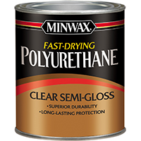 Minwax Fast-Drying Polyurethane, Oil Based, Series: 23005, Clear, Semi-Gloss, 0.5 pt Capacity, 125 sq-ft/qt Coverage, 108 deg F Flash Point, 536 g/l VOC, 0.860 Specific Gravity, Applicable Materials: Wood, Application Method: Brush, Lambs Wool, For Woodwork Furniture, Doors, Cabinets and Floors