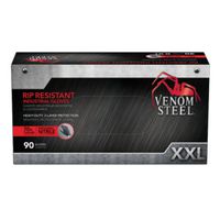 Venom Steel Industrial Nitrile Gloves provide heavy-duty protection with a unique two-layer design featuring a black outer layer and a white inner layer to easily identify breakthrough. These 6 mil thick gloves are 70% thicker than standard disposable options, offering superior resistance to rips, tears, punctures, and chemicals. Fully textured for an enhanced grip in wet or dry conditions, they are ideal for automotive, mechanical, and construction applications. These powder-free and latex-free gloves are touchscreen compatible and feature a beaded cuff for easy donning and removal.