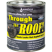 Through the Roof! Roof Sealant, 1 qt Capacity, Container, <300 g/l VOC, 40400 Dynamic Viscosity, Liquid, Clear, 3 sq-ft Coverage, 30 Min Tack-Free Drying Time, 1 week Functional Cure, Solvent Odor/Scent, 58 Deg F Flash Point, Media: Dry Chemical, Carbon Dioxide, Water Spray, Alcohol-Resistant Foam, Composition: P-Chloro-a,a,a-Trifluorotoluene, Toluene, Solvent Naphtha, Light Aliphatic, Flammability Rating: 3, 0.98 Specific Gravity, 0 - 120 Deg F Application, Applicable Materials: Metal, Plastic and Other Surfaces, Application Method: Foam or Paint Brush, 33 Shore A Shore, -25 To 180 Deg F, Resists: Excellent UV, Water and Mildew, Standards: Meets FHA Requirements, UL Listed, For Galvanized Metal and Aluminum Flashing, PVC and ABS Vent Pipe, Skylights, Gutters, Downspouts, Ductwork and Vents, Chimneys, Brick, Block and Mortar, Glue Down Shingles and Front Edges of Flat Roof Tiles, Metal Rv Roofs, Rubber Roof Membranes, Roof Jacks, Cables and Air Conditioning Units