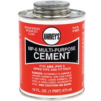 Harvey Solvent Cement, Series: MP-6, Medium Bodied, Medium Set, Multi-Purpose, 16 oz Capacity, Dauber Can Packing, 490 g/l VOC, 500 cPs Viscosity, Liquid, Milky Clear, 5 - 6 min at 30 - 50 deg F, 3 - 4 min at 50 - 70 deg F, 1 - 2 min at 70 - 90 deg F Setting, 2 hr Functional Cure, Ether Like Odor/Scent, 14 - 23 deg F Flash Point, Media: Carbon Dioxide, Dry Chemical, Foam and Water, Composition: Tetrahydrofuran, Cyclohexanone, Acetone, Methyl Ethyl Ketone, PVC (Chloroethylene, Polymer), Ethene, Chloro, Homopolymer, Chlorinated, Silica, Amorphous, Fumed, Crystalline Free, Flammability Rating: 1.8 LFL, 11.8 UFL, 0.94 Specific Gravity, 40 - 110 deg F Application, Applicable Materials: ABS, PVC and CPVC, Application Method: Bristle Brush or Roller, 250 psi For 2 hr, 500 psi For 16 hr, 900 psi For 72 hr Shear, Standards: ASTM D2564/D2235/F493, SCAQMD 1168/316A, BAAQMD Method 40, For Potable Water, Drain, Waste and Vent Systems