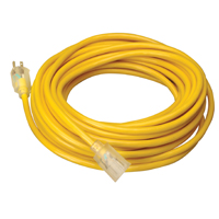 Designed for hard usage. Large cap and connector, thick flexible vinyl jacket, three conductor, lighted end to show when power is on. Store indoors when not in use. 15 amp/125 volt/1875 watts. Yellow. Sleeved. UL Listed, meets OSHA specifications.