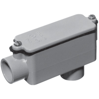 Rigid non-metallic Type LB conduit body. For easy access and pulling of wires through conduit run. For use with Schedule 40 non-metallic solvent weld fittings. Will not rust or corrode. With textured lid and foam-in-place gasket. Hubs are not threaded. UL Listed, RoHS Compliance.