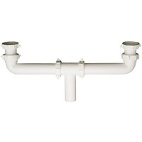 The Plumb Pak PP930W is a professional-grade 16-inch center outlet waste designed for efficient drainage in double bowl kitchen sink installations. Constructed from durable white polypropylene, this assembly features a built-in baffle tee to direct water flow effectively and prevent cross-flow between sink bowls. The versatile design supports both slip joint and direct connect installations, ensuring a secure and leak-free fit for standard 1-1/2 inch plumbing systems. Each kit comes complete with all necessary nuts and washers, providing a comprehensive solution for residential or commercial maintenance and repair projects.
