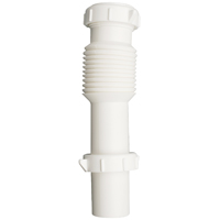 The Plumb Pak PP812-7 Flex N' Fix Sink Tailpiece is a versatile plumbing solution designed to simplify kitchen sink installations, especially in cases of misaligned drain pipes. Constructed from durable white polypropylene, this 1-1/2 inch diameter tailpiece features flexible bellows that allow for easy positioning and adjustment to bridge gaps between the sink and the drain. It offers the flexibility of either a slip joint or direct connection and comes complete with the necessary nuts and washers for a secure, leak-free fit. Ideal for both professional contractors and DIY repairs, this extension tube ensures a reliable and long-lasting connection in standard residential plumbing systems.