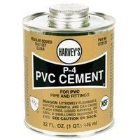 Harvey Solvent Cement, Series: P-4, Fast Set, Regular Bodied, 32 oz Capacity, Dauber Can Packing, 488 g/l VOC, 90 cPs Viscosity, Translucent Liquid, Clear, 6 - 7 min at 30 - 50 deg F, 4 - 5 min at 50 - 70 deg F, 1 - 3 min at 70 - 90 deg F Setting, 2 hr Functional Cure, Solvent Odor/Scent, -4 deg F Flash Point, Media: Alcohol Resistant Foam, Water Fog, Dry Chemical Powder, Carbon Dioxide, Composition: Methyl Ethyl Ketone, Cyclohexanone, Acetone, Polyvinyl Chloride, Flammability Rating: 3, 0.9+/-0.02 Specific Gravity, 40 - 110 deg F Application, Applicable Materials: PVC, Application Method: Bristle Brush or Roller, 250 psi For 2 hr, 500 psi For 16 hr, 900 psi For 72 hr Shear, Standards: ASTM D2564, SCAQMD 1168/316A, BAAQMD Method 40, For Potable Water, Pressure Pipe, Conduit and Drain, Waste and Ventilation Applications