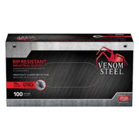 Venom Steel heavy-duty nitrile gloves provide superior hand protection for demanding industrial, automotive, and construction environments. These 6 mil thick gloves feature a unique two-layer design with a black outer surface and a white inner layer that helps quickly identify breakthrough or damage. Fully textured for an enhanced grip in wet or oily conditions, they are both powder-free and latex-free to minimize irritation and allergic reactions. Engineered for maximum durability, these rip-resistant gloves offer excellent protection against grease, chemicals, and punctures while maintaining tactile sensitivity.