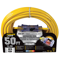 The Powerzone ORP511830 Pro SJTOW Extension Cord is a heavy-duty 12/3 gauge power solution engineered for demanding jobsite and outdoor environments. This 50-foot cord features a high-visibility yellow jacket that remains ultra-flexible in extreme temperatures ranging from -58°F to 221°F. It is equipped with a lighted locking female connector that provides a clear visual indicator of power while ensuring a secure, accidental-disconnect-proof connection for tools. Built to meet OSHA requirements and UL/CSA standards, this oil-resistant and flame-retardant cord is an essential component for professional contractors and industrial applications.